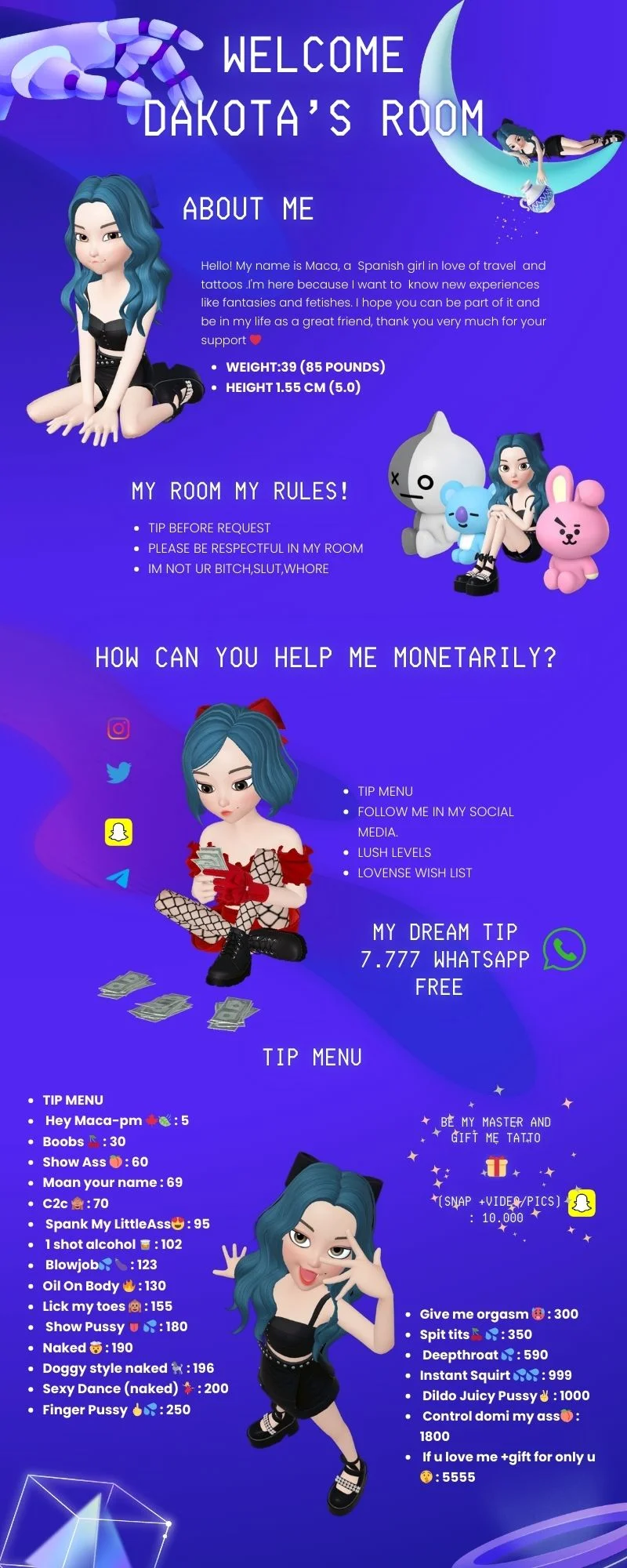 Hola! mi nombre es Maca,una chica enamorada de los viajes y los tatuajes .Estoy aquí porque deseo conocer nuevas experiencias como fetiches y fantasias , ademas deseo cumplir mi mayor sueño de tener mi propia casa y seguir estudiando desarrollo web además de tener una vida financiera estable… espero puedas hacer parte de ello y estar en mi vida como un gran amigo, muchas gracias por tu apoyo ❤️